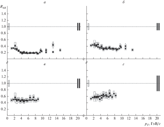 Зависимость величины фактора ядерной модификации RAA от поперечного импульса pT для нейтральных пионов (квадратные маркеры) и η-мезонов (круглые маркеры) в (U + U)-столкновениях при энергии 192 ГэВ: а – в центральных (0–20%), б – в полуцентральных (20–40%), в – в полуцентральных (40–60%), г – в периферийных (60–80%). Условные обозначения на точках в виде вертикальных “усов” и горизонтальных “прямоугольников” отвечают статистическим и систематическим погрешностям измерений соответственно.