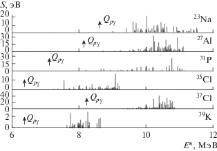 $\frac{{{{S}_{1}}}}{{{{S}_{2}}}} = \frac{{{{N}_{{{{{\gamma }}_{1}}}}}{{E}_{{{{r}_{1}}}}}{{b}_{2}}{{\eta }_{2}}}}{{{{N}_{{{{{\gamma }}_{2}}}}}{{E}_{{{{r}_{2}}}}}{{b}_{1}}{{\eta }_{1}}}},$Силы резонансов, составляющие резонансноподобные структуры (рис. 1), наблюдаемые в реакции радиационного захвата протонов ядрами 22Ne, 26Mg, 30Si, 34, 36S и 38Ar, были определены из сравнения интенсивностей γ-линий, образующихся при распаде изучаемых резонансных уровней с интенсивностью известных γ-линий, образующихся при распаде калибровочных резонансов. Для 23Na это резонанс при Ер = 1278 кэВ [18], для 27Al при Ер = 1966 кэВ [19], для 31P при Ер = = 1880 кэВ [20], для 35Cl при Ер = 1212 кэВ [9], для 37Cl при Ер = 1887 кэВ [21].