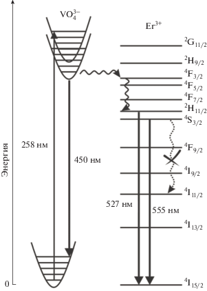 Энергетическая диаграмма уровней иона Er3+ и схема процесса даунконверсии с участием ванадатной группы.
