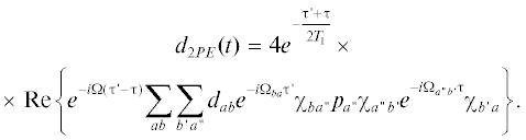 $\begin{gathered} {{d}_{{2PE}}}(t) = 4d{{\vartheta }^{3}}{{e}^{{ - \frac{{{\tau }{\kern 1pt} {\text{'}} + {\tau }}}{{2{{T}_{1}}}}}}} \times \\ \times \,\,\operatorname{Re} \left\{ {{{e}^{{ - i{\Omega }({\tau }{\kern 1pt} {\text{'}} - {\tau })}}}{{{\left\langle {{{e}^{{ - i\frac{{{{H}^{g}}}}{\hbar }{\tau }}}}{{e}^{{i\frac{{{{H}^{e}}}}{\hbar }{\tau }}}}{{e}^{{i\frac{{{{H}^{g}}}}{\hbar }{\tau }{\kern 1pt} {\text{'}}}}}{{e}^{{ - i\frac{{{{H}^{e}}}}{\hbar }{\tau }{\kern 1pt} {\text{'}}}}}} \right\rangle }}_{g}}} \right\}, \\ \end{gathered} $(35)