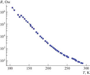 На рис. 1 представлены результаты измерений четырехзондовым методом электросопротивления R(T) образца LMO. Электрический ток протекал в плоскости образца перпендикулярно c-оси монокристалла LMO. Как видно из рисунка, электросопротивление имеет термоактивационную зависимость, характерную для полупроводникового типа проводимости, и соответствует поведению электросопротивления LMO, измеренному на аналогичных образцах [7].