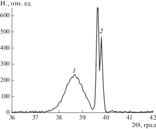 Фрагмент рентгенограммы двухслойной пленки LaMnO3/Ba0.8Sr0.2TiO3 на монокристаллической подложке (111) SrTiO3(STO): 1 – (111) BST; 2 – (111) STO.