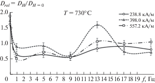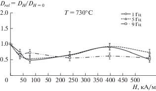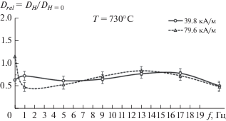 Степень влияния МП на КД Sn в α-Fe характеризовали относительным КД Drel(f, H) = = DH(f, H)/DH = 0, где DH(f, H) и DH = 0 – КД Sn в α‑Fe в ИМП с амплитудой напряженности H на частоте следования импульсов МП f и без поля соответственно; при этом измеренный КД без МП составлял DН = 0 = 6.9 ∙ 10–13 см2 ∙ с–1. Зависимости КД Sn в α-Fe от частоты импульсов Drel(f) и от амплитуды напряженности ИМП Drel(H) при температуре 730°С (далее частотная и полевая зависимости соответственно) измерены в интервале частот 1–21 Гц с дискретностью 4 Гц при амплитудах 39.8 (0.5 кЭ), 79.6 (1.0 кЭ), 238.8 (3.0 кЭ), 398.0 (5.0 кЭ) и 557.2 кА ∙ м–1 (7.0 кЭ). Зависимость КД Sn в α-Fe от амплитуды напряженности постоянного магнитного поля (ПМП) Drel(H) при температуре 730°С измерена при 39.8 (0.5 кЭ), 79.6 (1.0 кЭ), 238.8 (3.0 кЭ), 398.0 (5.0 кЭ) и 557.2 кА ∙ м–1 (7.0 кЭ).