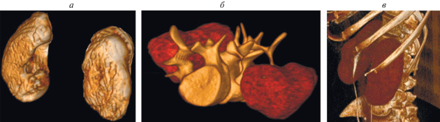 Адекватность полученной модели была проверена при сравнении 3D-модели фантома и модели реального пациента. Для этого использовался фантом почек и позвоночника. Результаты 3D-моделирования представлены на рис. 2б, 2в, из которого видно, что 3D-модель и модель, построенная для реального пациента, показывают адекватность соотношения рентгеновских плотностей материалов, используемых для изготовления фантома.