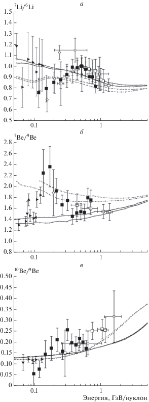 а – Отношения 7Li/6Li в зависимости от энергии ядер: ◼ – PAMELA, TOF, ◻ – PAMELA, калориметр, ▶ – CRIS (ACE), ▼ – VOYAGER, ◇ – NH, баллон, ▲ – UC, Berkley, ◻ – ISOMAX98, 1998, баллон [3]; расчеты, солнечный минимум (500 МВ): линия – Moskalenko I.V. et al. (2003) ГКЛ [4], пунктир – Moskalenko I.V. et al. (2003) локальные источники [4]; б – отношения 7Be/9Be в зависимости от энергии ядер: ◼ – PAMELA, TOF, ◻ – PAMELA, калориметр, ▶ – CRIS (ACE), ▲ – IMP-7,8, ▼ – VOYAGER, ◀ – ULYSSES, ◇ –NH, баллон [3]; расчеты, солнечный минимум (500 МВ): линия – Moskalenko I.V. et al. (2003) ГКЛ [4], пунктир – Moskalenko I.V. et al. (2003) локальные источники [4]; в – отношения 10Be/9Be в зависимости от энергии ядер: ◼ – PAMELA, TOF, ◻ – PAMELA, калориметр, ▶ – CRIS (ACE), ▼ – VOYAGER , ◀ – ULYSSES, ◻ – ISOMAX98, 1998, баллон [3]; расчеты, солнечный минимум (500 МВ): линия – Moskalenko I.V. et al. (2003) ГКЛ [4], пунктир – Moskalenko I.V. et al. (2003) локальные источники [4].