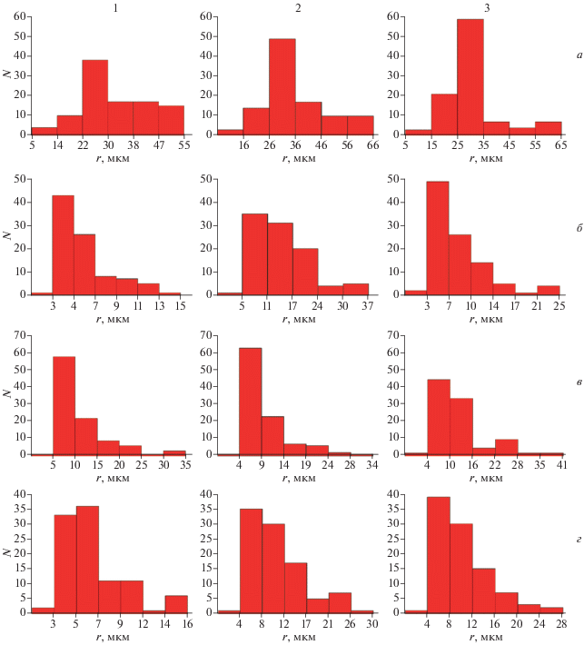 На рис. 4 и 5 показаны измеренные с помощью полученных профилограмм распределения расстояний между соседними ступеньками r (рис. 4) и распределения по размерам высоты ступенек h (рис. 5) для всех реализованных режимов деформации в камере Бриджмена и для трех различных зон анализа дискообразных образцов (1, 2 и 3). Первый структурный параметр характеризует, по существу, при определенных геометрических допущениях объемную плотность ПС VПС, а второй – мощность ПС eПС в различных зонах образцов при варьируемых условиях деформации КВД.
