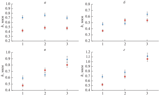 Зависимости средних значений (◼) и значений моды (▲) для параметра h при КВД; n = 0 (а), n = 1/64 (б), n = = 1/32 (в), n = 1/8 (г); 1, 2 и 3 – зоны наблюдения ПС.
