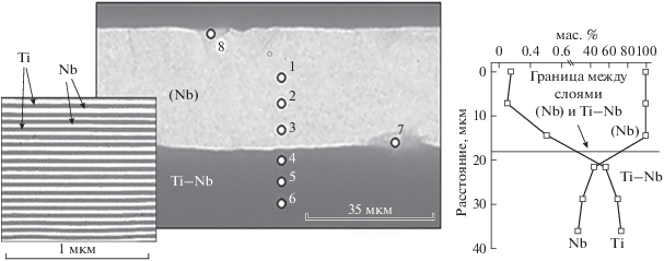 Кроме того, на Nb/Ti-границе в (Nb)-слое обнаружено присутствие диффузных образований с аномально большими, 75–85 мас. %, концентрациями титана (точки спектров 7 и 8, см. рис. 3а).
