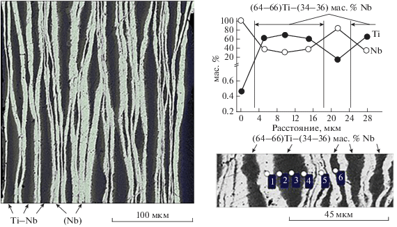 Локальный РС-анализ микроструктуры ленты (Nb)/Nb–Ti подтвердил предыдущие результаты. Темные слои титан-ниобиевого сплава содержали ∼34.5 мас. % Nb – это средняя концентрация ниобия, рассчитанная по четырем точкам спектра 2, 3, 4 и 6, приходящихся на слои Ti–Nb (рис. 5).