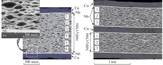 На рис. 8 показаны структуры двух других пакетов после диффузионных сварок во 2–м цикле. Первый из них толщиной 1.5 мм имеет семь многослойных отрезков (Nb)/(Nb–Ti) после 1-го цикла, два наружных Cu-стабилизаторов толщиной 0.15 мм и два Nb-экрана толщиной 20 мкм. Второй пакет толщиной 2 мм, кроме двух наружных стабилизаторов из меди, содержал такую же Cu-пластину для внутренней стабилизации сверхпроводящего состояния и, соответственно, еще два Nb-диффузионных барьера. Сверхпроводящий объем композита представлен двумя пачками из 4-х многослойных отрезков ленты (Nb)/(Nb–Ti) после 1-го цикла.