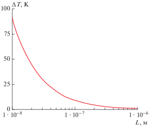 На рис. 2 построены зависимости смещения характерных температур ∆T = f(L), рассчитанных по формуле (9), для образца сплава Гейслера состава Ni50Mn18.5Ga25Cu6.5 в виде куба со стороной L в диапазоне 10–6–10–8 м. Здесь видно, что образец размером 1 мкм будет испытывать увеличение характерных температур на 0.9 градуса, размером 100 нм – 8.9 градуса, 10 нм – 91 градус. Уменьшение размера образца до 50 нм смещает характерные температуры до 17.9 К, а до 1 нм – до 893 К.