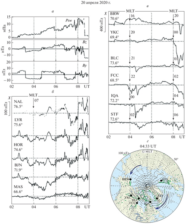 Межпланетные параметры и вариации геомагнитного поля в интервале 02–09 UT, в начальную фазу бури: динамическое давление солнечного ветра (Pdyn), BZ-, BY-компоненты ММП (а); вариации геомагнитного поля на станциях профиля IMAGE, находящихся в утрене-дневном секторе высоких широт (б) и на высокоширотных станциях американского сектора по данным (https://wdc.kugi.kyoto-u.ac.jp/plot_realtime/quick/202004/), находящихся в ночном секторе (в); мгновенная (в 04:33 UT – максимум суббури) карта пространственного распределения магнитных векторов по данным SuperMAG (г); вектора магнитного поля повернуты на 90° по часовой стрелке, чтобы они совпадали с направлением ионосферного тока.