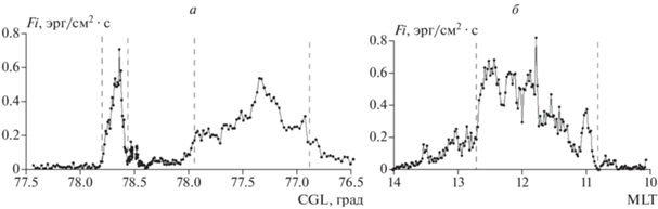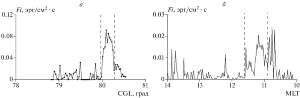 Все рассмотренные в настоящей работе индивидуальные пролеты спутников DMSP были зарегистрированы в северном полушарии при положительных значениях Bz компоненты ММП и отрицательных значениях By компоненты. Орбиты спутников солнечно ориентированы, поэтому MLT и угол пересечения спутником дневного каспа сильно зависят от угла наклона геомагнитного диполя к плоскости эклиптики и от широтного положения самой области каспа. На рис. 1 представлены два уникальных пролета спутника F13, конфигурация орбит которого относительно каспа позволяет на коротких временных интервалах проследить характеристики высыпаний в различных секторах MLT. Положение экваториальной и приполюсной границ каспа определялось по критериям [1] и отмечены на рисунках вертикальными штриховыми линиями. На рис. 1а показаны вариации потока энергии высыпающихся ионов (Fi, эрг · см–2 · с–1) в интервале 10:06–10:10 UT 18 марта 2002 г. По горизонтальной оси отложена исправленная геомагнитная широта (CGL) траектории спутника на высоте 110 км. Сначала, по мере увеличения широты спутник пересек касп в послеполуденном секторе, экваториальную границу на ~78.20° CGL и ~13.1 MLT и приполюсную на ~78.45° CGL и ~12.6 MLT. Выше каспа по широте были зарегистрированы высыпания мантии. Затем с уменьшением широты спутник вновь пересекал область каспа, но уже в предполуденном секторе, приполюсную границу на ~77.95° CGL и ~11.2 MLT и экваториальную на ~76.90° CGL и ~10.40 MLT. В каспе поток энергии высыпающихся ионов максимален по сравнению с соседними областями высыпаний – мантией, полюснее каспа, и низкоширотным граничным слоем (LLBL) экваториальнее него. Положение максимумов Fi в каспе было зафиксировано на 12.8 MLT и 10.6 MLT с разницей по времени регистрации в ~2 мин. Поток энергии высыпающихся ионов в максимуме составляет ~0.6 эрг · см–2 · с–1 и был несколько больше в послеполуденном секторе, чем в предполуденном. Примерные широтные размеры каспа определялись по разности широт его приполюсной и экваториальной границ. В послеполуденном секторе ширина каспа составляла ~0.25°, но касп значительно шире ~1.0° в предполуденные часы MLT. Узкий касп в послеполуденном секторе располагался в более высоких широтах, чем даже приполюсная граница каспа в предполуденные часы. Таким образом, центр каспа от предполуденных к послеполуденным часам смещается в более высокие широты под углом ~10° к геомагнитной параллели.