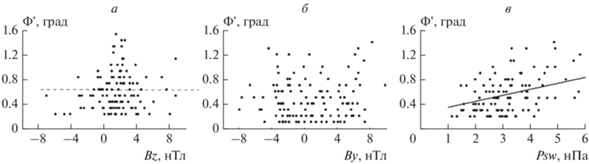 На рис. 2а–2в показаны широтные размеры каспа (ΔΦ') относительно Bz и By компонент ММП и Psw соответственно. Рисунки 2а и 2б демонстрируют отсутствие в нашем наборе данных связи между шириной каспа и компонентами ММП. Расположение точек от Bz ММП (рис. 2а) скорее напоминает нормальное распределение ширины каспа относительного среднего Bz = –0.5 нТл при средней/медианной ширине каспа 〈ΔΦ'〉 = = 0.6°. Отсутствует какая-либо зависимость ширины каспа от знака и величины By компоненты ММП (рис. 2б). Однако рис. 2в при значительном разбросе данных ясно демонстрирует тенденцию к росту ΔΦ' с увеличением Psw. Сплошная линия на рисунке соответствует уравнению линейной регрессии ΔΦ' = 0.25 + 0.10 Psw, коэффициент корреляции r = 0.52. В целом, рис. 2 дает основание полагать, что на ширину каспа наиболее эффективно влияет динамическое давление солнечного ветра, а не компоненты ММП, особенно при его положительной полярности, когда положение границ каспа фактически не меняется в зависимости от величины Bz компоненты.