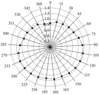 На рис. 3 показана диаграмма соотношений интенсивностей двух линий люминесценции в зависимости от угла поворота поляризатора. Видны плавные изменения в пределах от 0.8 до 1.2. В выбранной нами геометрии эксперимента направление угла 360–15 град соответствует минимуму интенсивности линии 1D2 → 3F4 на 480 нм. Максимальные значение эта линия имеет в области 90–270 град. Изменение относительных интенсивностей составляет примерно 40%. Соответственно, факт того, что не обнаружено направлений с близкой к нулю интенсивностью линий переходов 1D2 → 3F4 и 1G4 → 3H6, указывает на то, что их поляризации далеки от линейных. Чтобы определить степени поляризаций, нужны дополнительные эксперименты с измерением абсолютных величин, что требует существенно большей точности контроля позиционирования (менее 1 мкм). Однако уже тестовые измерений (рис. 3) свидетельствуют о разной степени и углах поляризаций излучательных переходов 1D2 → 3F4 и 1G4 → 3H6 в единичной АНЧ.