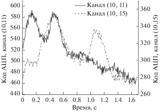 Первое событие зарегистрировано на краю поля зрения камеры, однако хорошо видно, что в месте регистрации присутствует довольно яркое свечение. Вследствие этого в большей части модулей фотоприемника детектора ТУС сработала система автоматической регулировки усиления (АРУ), переключая высокое напряжение на ФЭУ, что существенно затрудняет реконструкцию временного профиля. В связи с этим были выбраны два модуля с минимальной чувствительностью, где не происходило подстройки усиления. Осциллограммы двух каналов фотоприемника представлены на рис. 3. Представленные два канала являются соседними в матрице по диагонали (центры полей зрения на расстоянии 7 км). В целом видна схожая временная динамика с небольшим сдвигом в 1–2 такта измерения. Анализ частот пульсаций показывает, что основная мода лежит на частоте 4.2 Гц.
