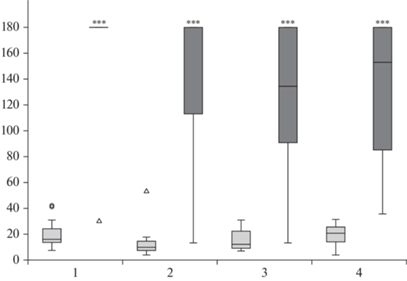 Выработка условной реакции пассивного избегания у самцов и самок мышей линий DISC1-L100P и C57BL/6. Светлые прямоугольники – латентный период перехода в темный отсек в день обучения, темные – латентный период перехода в темный отсек при тестировании через 24 ч после обучения. Показаны медиана, межквартильный размах (прямоугольники) – от первого до третьего квартиля, максимальное и минимальное значение данных в пределах 1.5 × IQR (усы); точки данных за пределами прямоугольников – выбросы (○) и экстремумы (Δ). По оси ординат – латентный период перехода в темный отсек, с; по оси абсцисс – группы мышей: 1 – самцы C57BL/6; 2 – самки C57BL/6; 3 – самцы DISC1-L100P; 4 – самки DISC1-L100P. *** – p < 0.001 по сравнению с днем обучения. Примечание: 11 из 12 самцов C57BL/6 показали максимальное время латентного периода перехода, и только 1 перешел на 30.8 с, из-за чего данный метод анализа рассматривает эту точку как экстремум, не учитывая ее в расчетах медианы, межквартильного размаха и усов, поэтому на графике все эти данные находятся в одной точке (180 с). Fig. 1. Acquisition of the passive avoidance response in male and female mice of strains DISC1-L100P and C57BL/6. Light boxplots show the latent period of transition in a dark compartment in the day of training, dark gray boxplots – the step through latencies at testing in 24 hours after training (median, from the first to third quartile (box) and the lowest and highest data points still within 1.5 × IQR (whiskers); data points falling outside boxes are considered outliers (○) and extremes (Δ)). On the ordinate axis – the latent period of transition to a dark compartment, s; on the abscissa axis – groups of mice: 1 – males C57BL/6; 2 – females C57BL/6; 3 – males DISC1-L100P; 4 – females DISC1-L100P. *** – p < 0.001 compared to the training day. Note: 11 out of 12 C57BL/6 males showed the maximum latency period of the transition and only 1 switched to 30.8 s, which is why this analysis method considers the point as an extremum, not taking it into account in the calculations of the median, interquartile range and whiskers, therefore, on the graph, all this data is at one point (180 s).