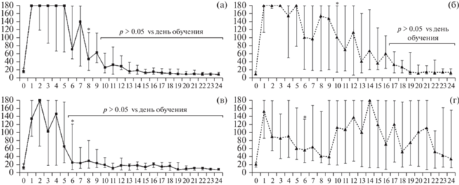 Половые и межлинейные различия угашения условной реакции пассивного избегания у мышей линий DISC1-L100P и C57BL/6: (а) – самцы C57BL/6; (б) – самки C57BL/6; (в) – самцы DISC1-L100P; (г) – самки DISC1-L100P. Показаны медиана и межквартильный размах (усы). По оси ординат – латентный период перехода в темный отсек, с; по оси абсцисс – порядковый номер тестирования. * – p < 0.05 по сравнению с первым днем тестирования (показано только начало угашения – то есть первый такой день); также показаны дни полного угашения условной реакции пассивного избегания (p > 0.05 по сравнению с днем обучения). Fig. 2. Sex and interstrain differences of the passive avoidance extinction in mice of strains DISC1-L100P and C57BL/6: (а) – males C57BL/6; (б) – females C57BL/6; (в) – males DISC1-L100P; (г) – females DISC1-L100P. Median and interquartile range (whiskers) are shown. On the ordinate axis – the latent period of transition to a dark compartment, s; on the abscissa axis – ordinal number of testing. * – p < 0.05 compared to the first day of testing (only the beginning of extinction is shown, that is, the first such day is marked); the days of complete extinction of passive avoidance conditioned reaction are also shown (p > 0.05 compared to the training day).