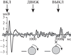 Пример ВП на включение (ВКЛ), начало движения (ДВИЖ) и выключение (ВЫКЛ) тестового сигнала, двигавшегося от центра вправо, предъявленного в тишине (тонкая черная линия) или на фоне центрального маскера (толстая серая линия). Стрелки около схемы головы соответствуют расчетной траектории движения тестового сигнала, а крестик – положению маскера. Стрелки над графиком показывают моменты наступления соответствующих слуховых событий. Fig. 1. An example of auditory event related potentials (ERPs) evoked by sound onset (ВКЛ), motion onset (ДВИЖ) and sound offset (ВЫКЛ). Test signal moving from the center to the right was presented in silence (thin black line) or against the background of the central masker (thick gray line). The arrows near the head scheme correspond to the calculated trajectory of the test signal, and the cross indicates the position of the masker. Arrows at the top show the moments of the corresponding auditory events.