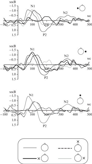 Вызванные потенциалы на выключение тестового сигнала, предъявленного в тишине или на фоне маскера разной локализации. Кружки около схемы головы демонстрируют положение тестового сигнала в момент выключения, а крестики – положение маскера. На всех графиках тонкая черная линия – сигнал без маскера, толстая черная линия – маскер у левого уха, пунктирная черная линия – маскер по центру головы, толстая серая линия – маскер у правого уха. Fig. 2. ERPs to the sound offset in silence or in the presence of a masker of different locations. The circles near the head scheme show the offset position of the test signal and the crosses show the position of the background masker. In all panels, thin black line corresponds to the signal presented in silence, thick black line – to the masker at the left ear, dotted black line – to the masker near the center, thick gray line – to the masker at the right ear.