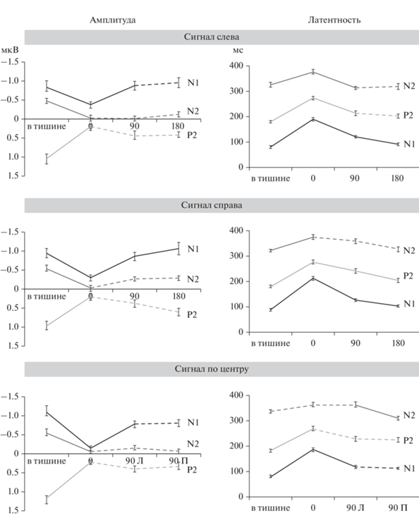 Зависимость амплитуды и латентности компонентов ВП на выключение от углового расстояния между сигналом и маскером. В левой части рисунка приведены графики амплитуды исследуемых компонентов, в правой – латентности. Рядам соответствуют положения тестового сигнала слева, справа и по центру. Все сочетания взаимного расположения сигнала и маскера отложены по категориальной оси абсцисс в порядке возрастания углового расстояния: в тишине (без маскера), 0, 90, 180 град между сигналом и маскером. Черная линия соответствует показателям компонента N1, светло-серая – компонента P2, темно-серая – компонента N2. Пунктиром обозначены недостоверные различия (p > 0.05) между соседними значениями. Вертикальными черточками показана стандартная ошибка. Fig. 3. Effect of the signal-masker angular distance on the amplitude and latency of ERP components to the sound offset. Left column: the ERP amplitude. Right column: the ERP latency. The rows (top-down) correspond to the positions of the test signal on the left/right or at the center. All combinations of signal and masker are plotted along the categorical abscissa in ascending order of the angular distance: in silence (without masker), 0, 90, 180 deg between the signal and the masker. Black line, light gray line and dark gray line correspond to the N1, P2 and N2 components, respectively. The dashed line indicates non-significant differences (p > 0.05) between neighboring values. Vertical lines represent the standard errors.