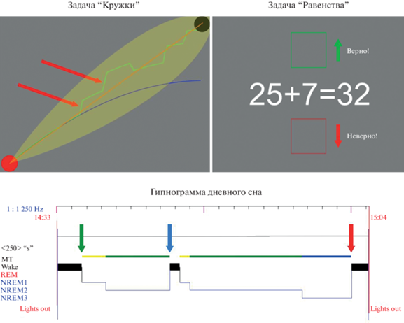 Добровольцам предлагали два типа задач – на зрительно-моторную координацию и на арифметический счет. Задачи демонстрировали на экране компьютерного монитора, расположенного на высоте около 1 м над ногами участника. В задаче на зрительно-моторную координацию “Кружки” испытуемый должен был управлять траекторией красного кружка, движущегося по экрану из левого нижнего угла по случайной параболе, и, поворачивая вверх и вниз колесико компьютерной мыши-кольца (закрепленной на пальце), направлять его в цель – черный кружок такого же размера в правом верхнем углу (рис. 1 слева сверху). В задаче на арифметический счет “Равенства” доброволец должен был ответить, верно ли предложенное арифметическое равенство или нет. На экране монитора ему предъявлялись правильные либо неправильные равенства и два полых квадрата сверху и снизу от примера – зеленый и красный. Выбор верности-неверности производился поворотом вверх и вниз колесика компьютерной мыши (в сторону зеленого или красного квадрата) (рис. 1 справа сверху). Каждая задача включала в себя 40 проб (40 движущихся кружков либо 40 примеров) и длилась 2 мин. В зрительно-моторной задаче каждая проба длилась 2.5 с и между пробами отсутствовали паузы. Длительность пробы в арифметической задаче составляла 3 с, и пробы были разделены между собой фиксационной точкой длительностью в 0.5 с. Однако добровольцы в нормальном состоянии решали каждое равенство быстрее отведенного времени – приблизительно за 2 с. Поэтому в среднем длительность проб (вместе с паузами) в обеих задачах была одинаковой и составляла 2.5 с. В задаче “Кружки” все параболы, по которым вылетали кружки, задавались случайным образом. Половина проб в задаче “Равенства” представляла собой сложение двух однозначных чисел, а вторая половина – сложение двузначного и однозначного чисел. Два типа сложений были распределены в задаче квазислучайно и были примерно одинаковы по сложности. Задачи предъявлялись в бодрствовании до и после сна (обе задачи), а также во время форсированного пробуждения от дневного сна – сразу же после пробуждающего сигнала (одна из задач).