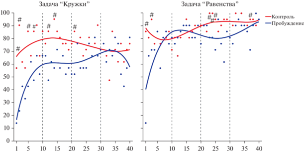 Динамика изменения вероятности верного решения задач (n = 26). По оси ординат – количество участников эксперимента (в процентах), правильно решивших данную пробу, по оси абсцисс – номер пробы. Жирными кривыми показаны линии полиномиального тренда степенью 4. # – p < 0.05. Fig. 2. The dynamics of change in the probabilities of correct solution of each trial (n = 26). X-axis – the number of participants in the experiment (in percent), correctly solved this test; Y-axis – the trial number. Bold lines show polynomial trend lines of degree 4. # – p < 0.05.