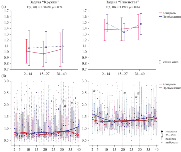 Результаты дисперсионного анализа ANOVA для повторных измерений для взаимодействия факторов “состояние” × “группы проб” (а) и изменения времени первой реакции (б) для задач “Кружки” и “Равенств” (n = 26). По оси ординат – время первой реакции (сек), по осям абсцисс – группы проб (а) и номер пробы (б). Жирными кривыми показаны линии полиномиального тренда степенью 4 для медиан. # – p < 0.05. Fig. 3. Repeated measures ANOVA results for factor interactions “State” X “Trial groups” (а) and changes in the first reaction time (б) for the motor task “Circles” and the cognitive task “Equalities” (n = 26). X-axis – the first reaction time (sec), Y-axes – the trial groups (а) and the trial number (б). Bold lines show polynomial trend lines of degree 4 for median. # – p < 0.05.