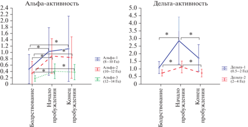 3. При пробуждении в течение первых 1.5 мин сохраняется более высокая, чем в бодрствовании, спектральная мощность альфа- и бета-активности.