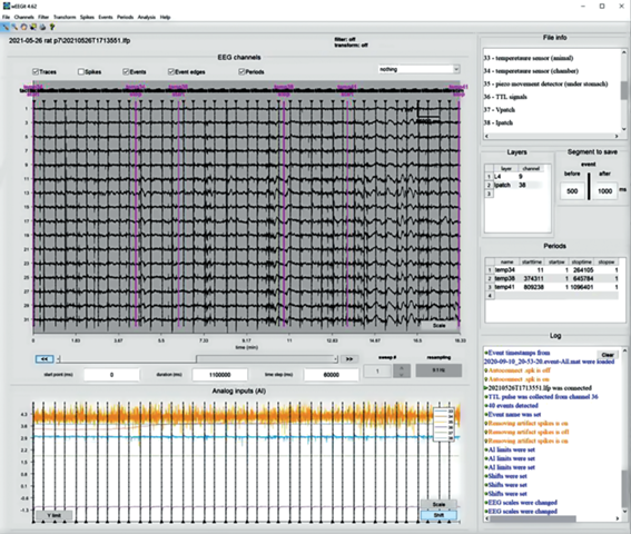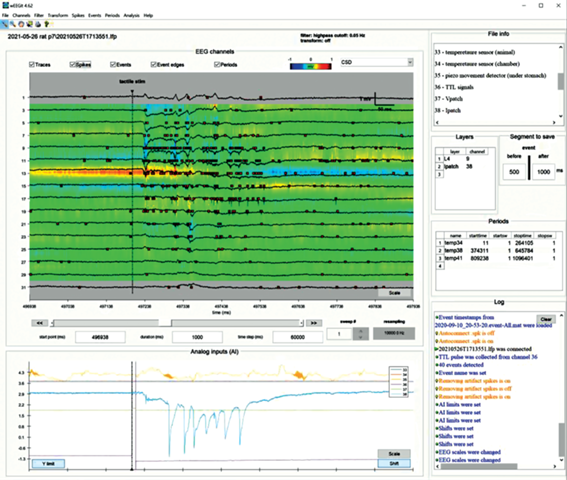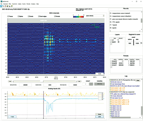 WEEGIT interface view 1, using spike density as background. The main panel (EEG channels) displays amplifier channels extracted from the electrophysiological record. The additional panel (Analog inputs (AI)) displays data from other sensors (e.g., telemetry sensors) synchronized with electrophysiological data. General information panel (File info) is intended for downloading (in *.txt format) and/or creating and editing text information about the current record. The panel of morphological labels (Layers) is used for marking the correspondence of channels to morphological structures. The segment saving panel (Segment to save) contains editable time values defining intervals before and after each event (in milliseconds) that will be used to save data segments around the event timestamp. The period information panel (Periods) is used to enter/edit time period information if the user needs to mark the time period during which the experiment conditions were changed/intact. The action overview panel (Log) displays non-editable information about ongoing user actions. Рис. 1. Вид 1 интерфейса WEEGIT, в качестве фона используется плотность потенциалов действия. На основной панели (EEG channels) отображаются данные регистрации электрофизиологической записи для каждого канала усилителя. На дополнительной панели (Analog inputs (AI)) отображаются данные с других датчиков (например, с телеметрических сенсоров), синхронизированные с электрофизиологическими данными. Панель общей информации (File info) предназначена для загрузки (в формате *.txt) и/или создания и редактирования текстовой информации о текущей записи. Панель морфологических меток (Layers) предназначена для обозначения соответствия каналов морфологическим структурам. Панель сохранения сегментов (Segment to save) содержит редактируемые значения времени, определяющие интервалы до и после события (в миллисекундах), которые будут использоваться для сохранения сегментов данных вокруг временной метки каждого события. Панель информации о периодах (Periods) используется, если необходимо, для ввода/редактирования информации о периоде времени, в течение которого изменялись/сохранялись условия эксперимента. Панель обзора действий (Log) отображает нередактируемую информацию о действиях пользователя.