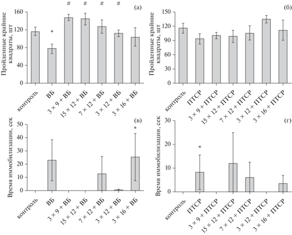 Результаты поведенческого тестирования в тесте “открытое поле”. (а) – горизонтальная двигательная активность крыс модели ВБ, ВБ+ИГТ и контроля, количество пройденных крайних квадратов открытого поля. (б) – горизонтальная двигательная активность крыс модели ПТСР, ПТСР + ИГТ и контроля, количество пройденных крайних квадратов. (в) – время иммобилизации крыс модели ВБ, ВБ + ИГТ и контроля, секунды. (г) – время иммобилизации крыс модели ПТСР, ПТСР+ИГТ и контроля, секунды. Контроль (n = 12), ВБ – группа ВБ (n = 12), 3 × 9 + ВБ, 15 × 12 + ВБ, 7 × 12 + ВБ, 3 × 16 + ВБ – группы ВБ в сочетании с указанным режимом ИГТ, соответственно (n = 6), ПТСР – группа модели ПТСР (n = 6), 3 × × 9 + ПТСР, 15 × 12 + ПТСР, 7 × 12+ ПТСР, 3 × 16 + ПТСР – группы модели ПТСР в сочетании с заданным режимом ИГТ, соответственно (n = 6 в каждой). * – достоверное отличие от контрольной группы, # – достоверное отличие от группы соответствующей патологии, p < 0.05, критерий Манна–Уитни. Fig. 1. The results of behavioral testing in the “open field” test. (a) – horizontal locomotor activity of rats of the LH model, LH + IHT and control, the number of lateral squares of the open field passed. (б) – horizontal locomotor activity of rats of the PTSD model, PTSD + IHT and control, the number of lateral squares passed. (в) – the time of freezing of rats of the LH model, LH + IHT and control, seconds. (г) – the time of freezing of rats of the PTSD model, PTSD+IHT and control, seconds. Control – control animals (n = 12), LH – group of LH (n = 12), 3 × 9 + LH, 15 × 12 + LH, 7 × 12 + LH, 3 × 16 + LH – groups of LH combined with the specified IHT regime, respectively (n = 6), PTSD – group of model PTSD (n = 6), 3 × 9 + PTSD, 15 × 12 + PTSD, 7 × 12 + PTSD, 3 × 16 + PTSD are groups of the PTSD model combined with the specified IHT mode, respectively (n = 6 in each). * – significant difference from the control group, # – significant difference from the group of the corresponding pathology, p < 0.05, Mann–Whitney test.
