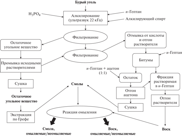 Выделение восков и смол (См) из БУТ проводили в соответствии со схемой на рис. 1. Экстракции битумов предшествовала стадия О-алкилирования бурого угля БУТ под воздействием ультразвука частотой 22 kHZ [4, 16]. Воздействие ультразвуком значительно снижает продолжительность процесса алкилирования и увеличивает выход битумов (в условиях эксперимента [16, 17], с 39.1 до 56.4%). В качестве алкилирующего агента использовали н-бутанол, в качестве растворителя – н-гептан, в качестве катализатора – ортофосфорную кислоту. Полученные фракции битумов (воск и смола) дополнительно фракционировались в условиях реакции омыления (рис. 1).