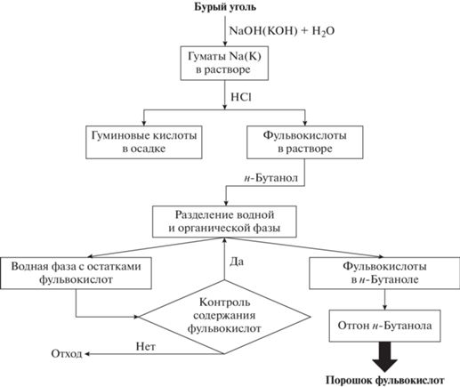 Фульвокислоты извлекали из солянокислых растворов, полученных при осаждении ГК из водных растворов гумата калия по методике [15]. Схема процесса извлечения ФК представлена на рис. 2.