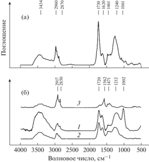 ИК-спектры: (а) – фульвокислот; (б) – смолы (1), ее омыляемой (2) и неомыляемой (3) составляющей.