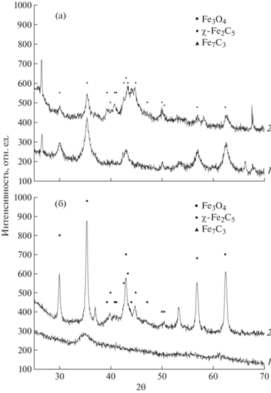 В процессе каталитических испытаний происходит формирование смеси магнетита (2θ –30.08; 35.43; 43.05; 56.94; 62.52° (JCPDS-79-0419)) и нестехиометрических карбидов – χ – Fe5C2 (2θ – 39.31; 40.83; 41.15; 43.40; 44.07; 47.18 (JCPDS-51-0997)) и Fe7C3 (2θ – 39.98; 42.60; 44.90; 50.04; 50.50 (JCPDS-75-1499)). Формирование фазы карбидов характерно для синтеза Фишера–Тропша, и может свидетельствовать о протекании процесса роста углеводородной цепи. Отдельно стоит отметить, что из рентгеноаморфного на стадии приготовления катализатора образца Fe/БУ-Ц формируется более кристаллический образец, чем в случае Fe/БУ-Л. Это может указывать на то, что у образца Fe/БУ-Л происходит более сильная фиксация активных в процессе гидрирования монооксида углерода частиц на поверхности.