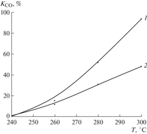 Конверсия монооксида углерода в присутствии катализаторов на основе углеродных материалов: 1 – Fe/БУ-Л; 2 – Fe/БУ-Ц.