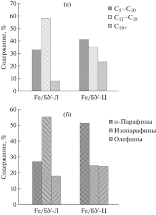 В присутствии катализатора Fe/БУ-Л происходит значительное образование изопарафинов (рис. 3, б), на долю которых приходится 55%. Тогда как на катализаторе Fe/БУ-Ц содержание изопарафинов не превышало 25%, а основными компонентами были н-парафины – 51%. Можно предположить, что образующаяся в процессе приготовления катализатора фаза магнетита может выполнять роль кислотного центра, на котором происходит образование изопарафинов. В работе [17] показано, что изомеризующая способность катализаторов линейно зависит от общей кислотности поверхности. Для магнетита характерно то, что кислотность его поверхности зависит от размера частиц [30], из чего можно заключить, что формирующиеся в процессе синтеза Фишера–Тропша частицы магнетита, зарегистрированные в образце Fe/БУ-Л, предположительно меньшего размера (рис. 1, а), вследствие чего их изомеризующая способность выше, чем в образце Fe/БУ-Ц.
