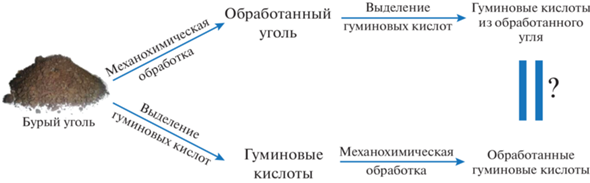 Чтобы ответить на эти вопросы, был поставлен ряд экспериментов (рис. 1). Уголь и выделенные из угля гуминовые кислоты подвергали механохимической обработке в одинаковых условиях. Окисление проводили кислородом воздуха и перкарбонатом натрия (также на воздухе). В полученных образцах исследовали изменения структуры при помощи CHNO-анализа, ИК-спектроскопии и потенциометрического титрования, изучали сорбционные свойства по отношению к ионам тяжелых металлов (Zn2+, Cu2+ и Cd2+).