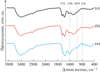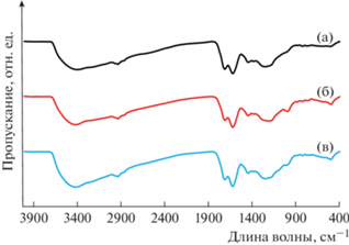 ИК-спектры гуминовых кислот до (а) и после механохимической обработки в разных условиях: без добавки реагентов (б) и с добавкой перкарбоната натрия (в).