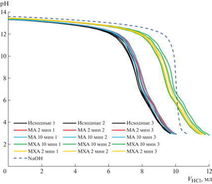 ИК-спектры исследуемых гуминовых кислот типичны для данного класса соединений (рис. 2). Остановимся на описании полос, имеющих различия между образцами. Спектр исходных и обработанных на воздухе гуминовых кислот характеризуется выраженной полосой 1718 см–1 (С=О-группа преимущественно в карбоксильных группах), что типично для гуминовых кислот [27]. На ИК-спектрах ГК, прошедших МХА-обработку с перкарбонатом натрия, данная полоса не выделяется. Как правило, такие образцы представляют собой соли металлов – гуматы, а не гуминовые кислоты [28, 29]. Также для МХА образца наблюдается увеличение поглощения в районе 1400 см–1, что относят одновременно к C-H-участкам CH3- и CH2- групп, и к C-O- связям фенольных групп [29]. У рассматриваемого образца снижено поглощение в области 1099 см–1, относящейся к C=O- карбоксильных групп. Это дает основание предположить, что снижение поглощения при 1718 см–1 связано не только с реакцией нейтрализации, переводящей гуминовые кислоты в форму гумата натрия, но и с возможной реакцией декарбоксилирования, сопровождающейся снижением количества карбоксильных групп. Подобный эффект механохимической обработки перкарбонатом натрия ранее был показан Vakili на хитозане, который сопровождается деацелированием [30]. Для проверки предположения о декарбоксилировании при механохимической обработке в присутствии перкарбоната было проведено потенциометрическое титрование образцов (рис. 3, табл. 2). По расположению кривых видно, что исходные гуминовые кислоты содержат большее количество кислотных групп, чем образцы, прошедшие механохимическую обработку. Из рассчитанных значений видно, что окисление гуминовых кислот перкабонатом натрия приводит к уменьшению количества карбоксильных групп. Увеличение доли кислорода, установленное CHNО-анализом, свидетельствует о том, что окисление гуминовых кислот перкарбонатом натрия происходит с образованием других кислородсодержащих групп, например, эфирных, или карбонильных групп хинонов и кетонов, которые не определяются методом потенциометрического титрования.