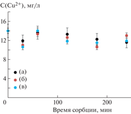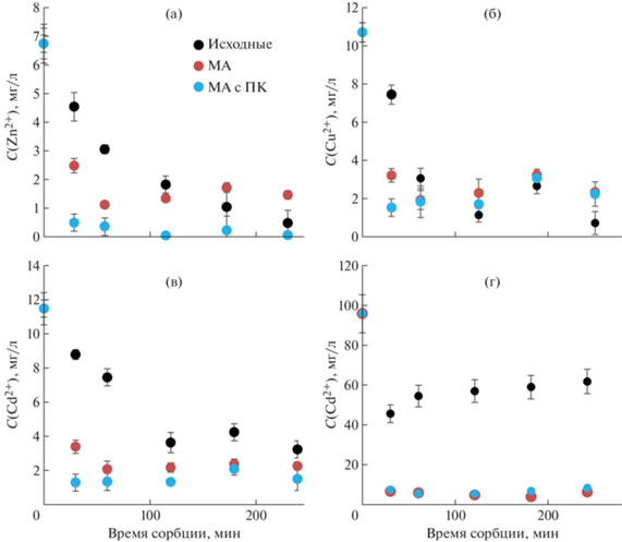 Очевидно, что изменение количества функциональных групп должно значительно отразиться на сорбционных свойствах. Важно отметить, что механическая обработка приводит к значительному увеличению площади поверхности образцов, что, в свою очередь, также может привести к росту сорбционных свойств. Чтобы разделить влияние количества функциональных групп и площади поверхности на сорбцию металлов гуминовыми кислотами, исследование сорбционных свойств проводили при двух значениях pH: 4 и 8. При значении pH = 4 ионообменные группы гуминовых кислот находятся в протонированном состоянии и не склонны к диссоциации, соответственно сорбция металлов будет проходить за счет физических взаимодействий металлов с поверхностью, а изменения будут зависеть только от изменения площади поверхности. Результаты на примере меди представлены на рис. 4. Для ионов меди, кадмия и цинка не удается добиться снижений концентраций металлов, выходящих за пределы погрешности измерений, как для исходных, так и для измельченных в результате обработки гуминовых кислот. Удельная площадь поверхности гуминовых кислот при этом изменяется более, чем в 2 раза (~2 м2/г у исходных гуминовых кислот и 4–5 м2/г после механохимической обработки). Таким образом, можно сказать, что физическая адсорбция ионов металлов на поверхности гуминовых кислот идет в незначительной степени, и различия и сорбционные свойства, проявляемые гуминовыми кислотами при pH = 8, объясняются именно изменением количества функциональных групп или их переводом в солевую форму. Данные по сорбции металлов при pH = 8 представлены на рис. 5. Продемонстрировано, что как МА, так и МХА гуминовые кислоты быстрее и с большей эффективностью выводят ионы цинка, меди и кадмия из воды.