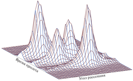 Эксперименты по рассеянию нейтронов проводили на нескольких импульсных источниках с использованием техники времени пролета. В этом методе основная развертка спектра ведется по длине волны нейтрона, что эквивалентно сканированию вдоль радиус-вектора в обратном пространстве кристалла. В сочетании с однокоординатным позиционно-чувствительным детектором метод позволяет организовать одновременный набор информации в сравнительно большом двумерном секторе обратного пространства кристалла. Рабочие интервалы длин волны и углов рассеяния, как правило, составляли 0.6–6 Å и 12° соответственно. При стандартных минимальных шагах межплоскостных расстояний 0.01 Å и углов рассеяния 0.25° двумерная нейтронограмма содержит ~15 × 103 “точек”, причем все их измеряют одновременно. Пример измеренного таким образом распределения интенсивности в одном из узлов обратной решетки монокристалла KD2PO4 (DKDP), находящегося в сегнетоэлектрической фазе при температуре Т = 80 К, показан на рис. 1. Большая часть экспериментов была выполнена на импульсных реакторах ЛНФ – сначала на ИБР-30 (работы конца 1970-х гг.), затем на ИБР-2. Кроме того, измерения дифракции, неупругого и квазиупругого рассеяния были проведены на источнике ISIS (RAL, UK).