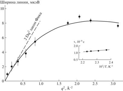 Метод квазиупругого рассеяния нейтронов позволяет экспериментально определить временные и пространственные характеристики процессов диффузии. Это было реализовано в экспериментах на гидросульфате цезия, проведенных с энергетическим разрешением спектрометра 15 и 50 мкэВ [32, 33]. При разрешении 15 мкэВ наблюдалось однородное уширение линии в спектре упругого рассеяния нейтронов. Этот факт однозначно указывал на трансляционную диффузию протонов в кристалле. Количественный анализ данных основывался на модели прыжковой диффузии протонов по регулярной сетке кристаллографических позиций, определенных по данным порошковой нейтронной дифракции высокого разрешения. На рис. 10 приведены для сравнения с модельным описанием процесса экспериментально определенные ширины линии в зависимости от квадрата вектора квазиупругого рассеяния нейтронов при 433 К. На вставке к рисунку показана зависимость времени корреляции (время жизни протона в кристаллографической позиции) от температуры. На основе модельного описания экспериментальных данных было получено расстояние между ближайшими позициями протонов 2.8 Å, которое практически идеально согласуется с кристаллографическими данными. В области малых значений векторов рассеяния нейтрона, что соответствует гидродинамическому пределу, когда микроскопические параметры процесса диффузии усредняются по всему образцу, результаты нейтронного эксперимента можно сравнить с данными ядерного магнитного резонанса (ЯМР) [34]. На рис. 10 пунктиром показан закон Фика с коэффициентом диффузии, полученным в ЯМР-экспериментах. Макроскопический коэффициент диффузии из данных нейтронного рассеяния был рассчитан по формуле D = l2/6τ, где l – расстояние между ближайшими позициями протонов в кристалле, τ – время жизни протона в позиции. В результате в диапазоне температур 423–448 К изменения коэффициента диффузии протонов оказались в пределах (1.00–1.17) × 10–7 см2/с, что хорошо согласуется с данными ЯМР.