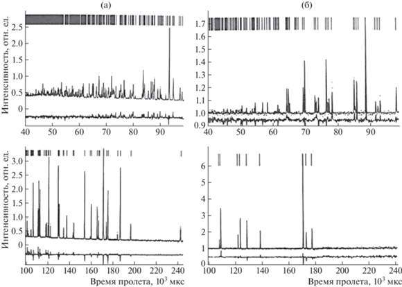 Измеренный (точки) при температурах 300 (а) и 448 К (б) на нейтронном дифрактометре HRPD (ISIS) и вычисленный методом Ритвельда (линия) спектры CsDSO4. Внизу показана разностная функция. Штрихи вверху – вычисленные положения дифракционных пиков [25].