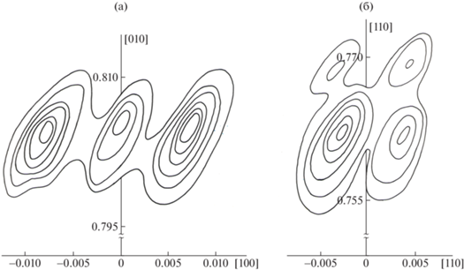 Распределение дифракционной интенсивности в узлах 060 (а) и 440 (б) обратной решетки кристалла DKDP при T = 80 К. Единицы по осям отложены в Å–1 [5].