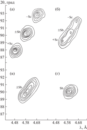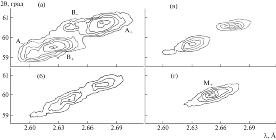 Переход KDP и DKDP в сегнетофазу сопровождается трансформационным двойникованием кристалла и образованием составной обратной решетки по механизму “чистых” или “простых” сдвигов. Из симметрийного анализа, проведенного Л.А. Шуваловым, следовало, что в случае “простых” сдвигов одиночные узлы обратной решетки парафазы, расположенные на базовых направлениях a* и b* (типа h00 или 0k0), расщепятся на три компоненты, а узлы типа hh0 – на четыре компоненты. Эксперимент, проведенный на реакторе ИБР-30, полностью подтвердил этот анализ (подробное изложение метода и полученных результатов дано в [1]). Построенные в координатах обратного пространства распределения интенсивности (рис. 3) ясно демонстрируют наличие четырех систем доменов с разными степенями заселенности. Их принято обозначать как ±Sa и ±Sb, где знак соответствует направлению спонтанной поляризации. После нахождения центров распределений были рассчитаны (для T = 80 К) угол спонтанного сдвига uxy ≈ 0.5° и изменения параметров ячейки при ФП |Δa| ≈ |Δb| ≈ 0.52 Å (соответствующие формулы приведены в [1]). Эти величины близки к данным рентгеноструктурного анализа [4].