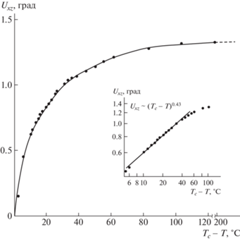 Температурная зависимость угла спонтанного сдвига, измеренная в ходе охлаждения образца (ТC = 283 К). На вставке зависимость показана в двойном логарифмическом масштабе [8].