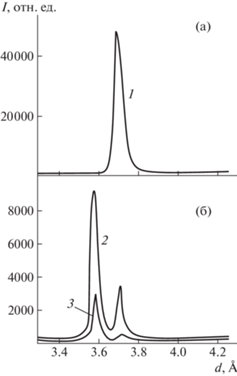 Вариации профиля дифракционного пика кристалла CDSe при образовании в нем блоков в ходе циклирования по температуре 376 (а) и 406 К (б): 1 – исходное состояние, фаза II, 2 – сразу после перехода в фазу I, 3 – после охлаждения, перехода в фазу II и возврата в фазу I [15].