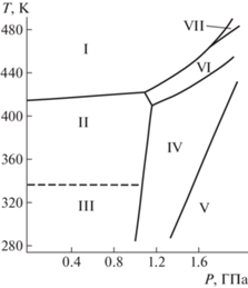 При приложении высокого давления к кристаллу гидросульфата цезия наблюдается целый ряд ФП. Фазовая диаграмма Р–Т была установлена на основе измерений электропроводимости и зависимости объема кристалла от давления и температуры (рис. 8) [21]. Структурные данные при высоких давлениях были получены на дейтерированных образцах CsDSO4, но на их основе удалось определить только симметрию соответствующих кристаллических решеток [22, 23]. Результаты были получены с учетом информации об изменении объема кристалла при ФП II–IV–V и с привлечением теоретико-групповых предсказаний о возможных ФП в данном кристалле [24]. Так, было установлено, что фаза IV моноклинная и при комнатной температуре и давлении 1.2 ГПа параметры ее ячейки равны a = 10.752, b = 4.593, c = = 9.861 Å, β = 113.42°, V = 446.9 Å3, Z = 4, пр. гр. P21/m. Фаза V также моноклинная с параметрами ячейки при комнатной температуре и давлении 2.0 ГПа a = 10.574, b = 4.225, c = 9.920 Å, β = 94.7°, V = 441.9 Å3, Z = 4. Однозначно установить пр. гр. данной фазы не удалось. Она может быть либо P21/m, либо P21. Второй случай кажется менее вероятным, поскольку он означает, что с повышением давления симметрия кристалла понижается. Несмотря на то что прямых экспериментов по структуре фазы VI, реализующейся при высоких давлениях и повышенной температуре, сделано не было, на основе теоретического анализа возможных симметрийных ФП в данном соединении можно сделать некоторые предсказания. Принимая во внимание, что возможна последовательность ФП I–VI–IV и, по всей видимости, VI–V, симметрия фазы VI должна быть ромбической и описываться пр. гр. Pnma. Следует также исключить возможную симметрию P21 фазы V и считать, что ее пр. гр. P21/m.