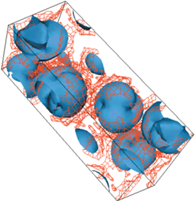 Распределение атомной плотности в элементарной ячейке CsDSO4. Сетка показывает поверхность одинаковой вероятности нахождения протонов и демонстрирует трехмерные каналы протекания. Искаженные сферические оболочки соответствуют сульфатным группам. Атомы цезия не показаны для наглядности [29].